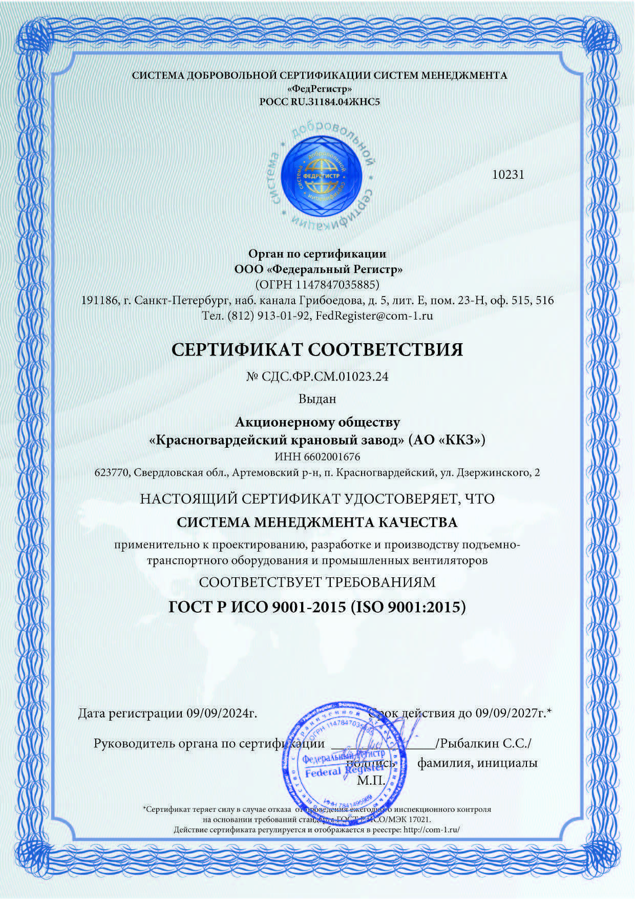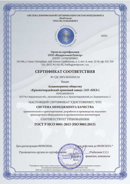 Система менеджмента качества АО "ККЗ" Система менеджмента качества АО «Красногвардейский крановый завод» функционирует с 2008 года, соответствует требованиям ГОСТ Р ИСО 9001-2015(ISO 9001:2015).Сертификат соответствия № СДС.ФР.СМ.01023.24" Обратно